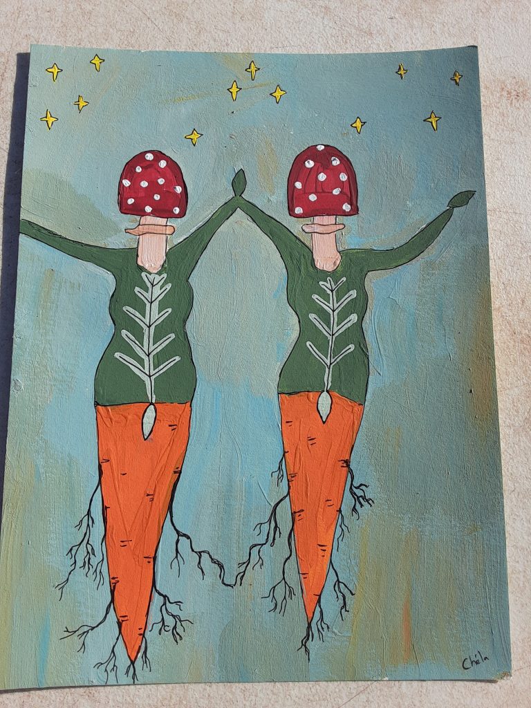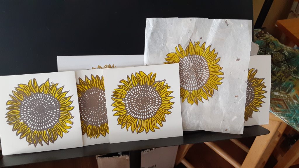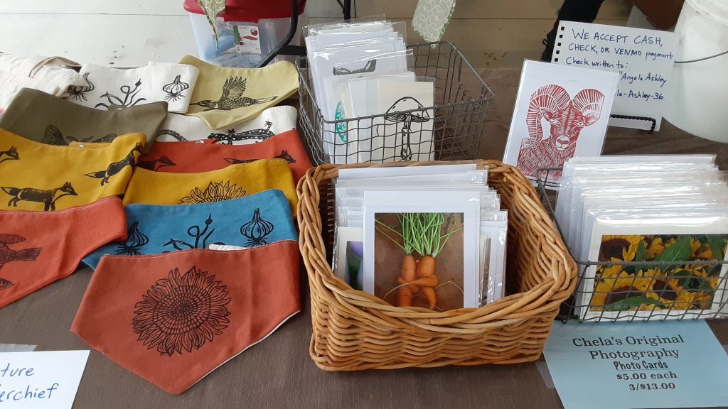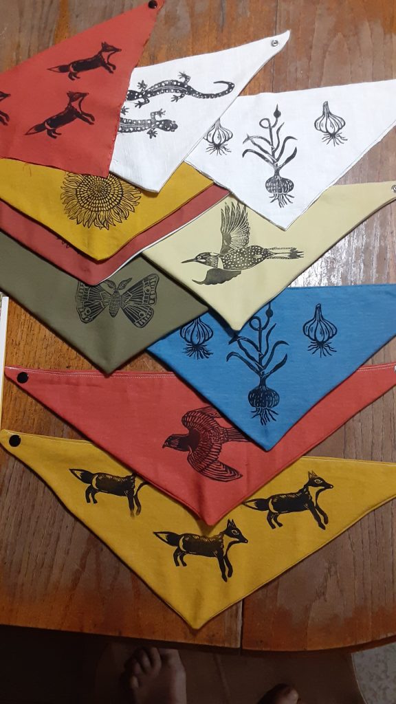 Chela hand carves lino-cuts and prints on clothing, cloth napkins, cards, and more. Her designs are inspired by her years of observing nature as a gardener, hiker, and wild woman. You can also find her nature photography as cards to frame or send to a loved one. In addition to her long career as a market gardener, she beads, embroiders, and paints too.