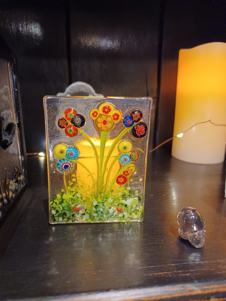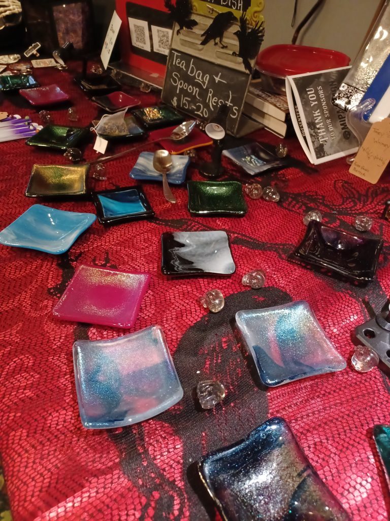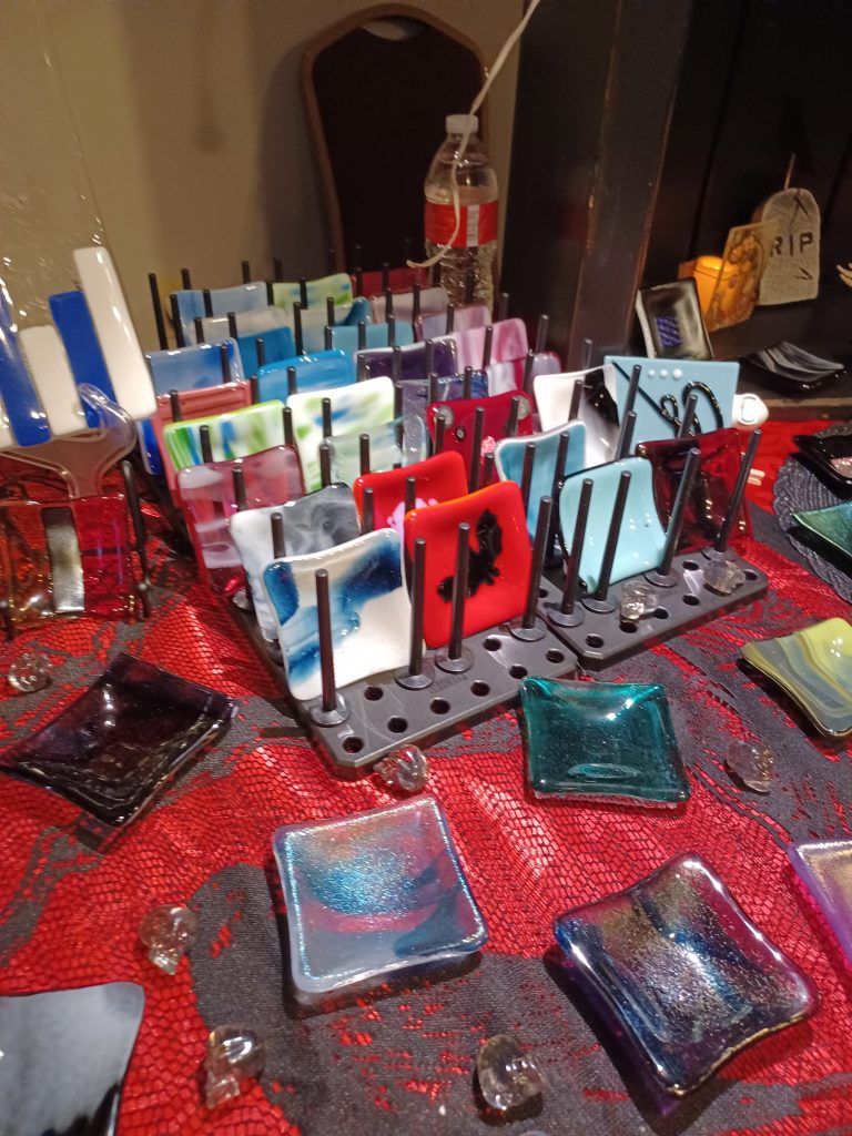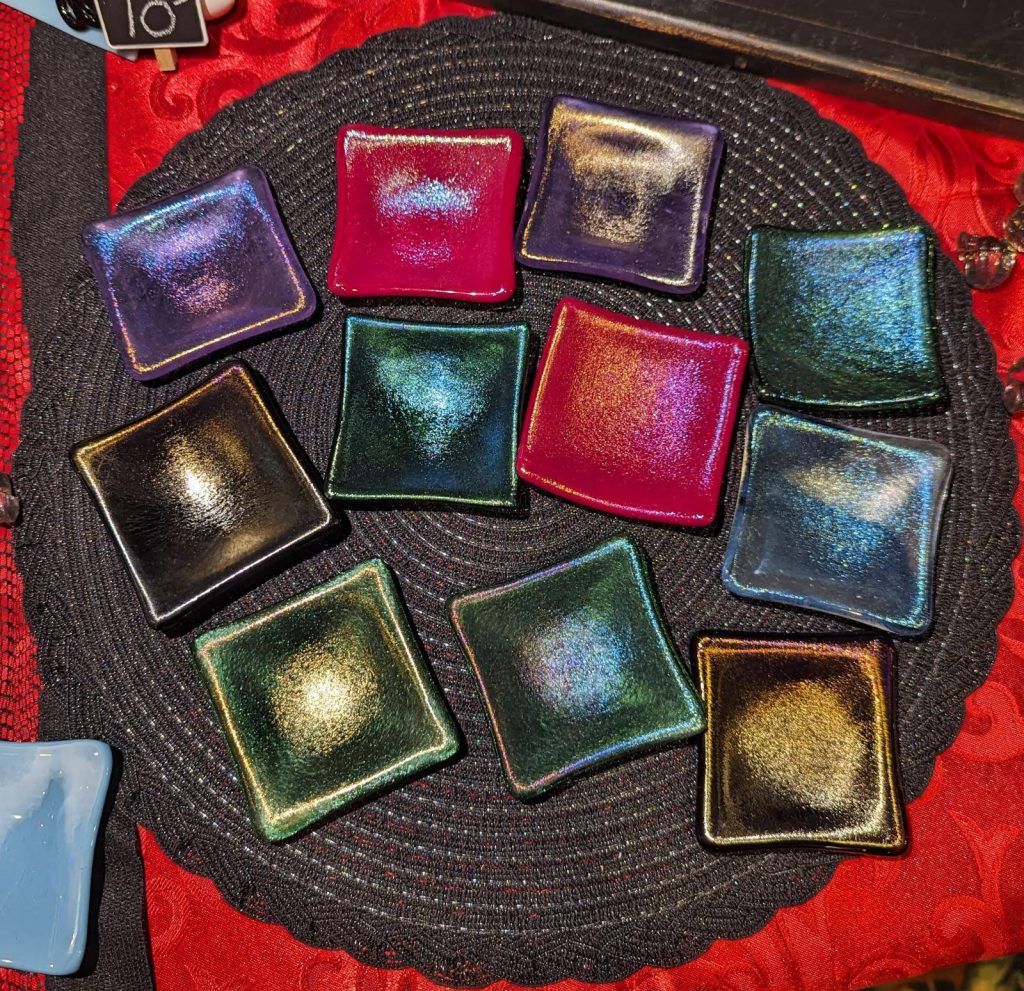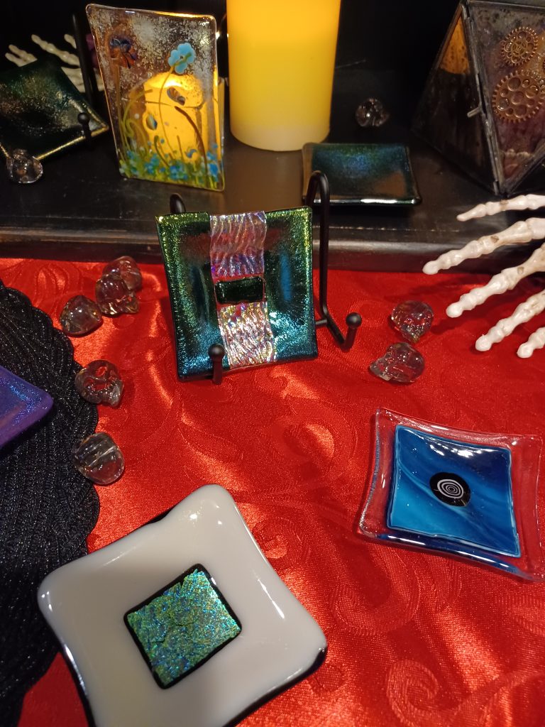 Mother-daughter team Susan and Sam make and design fused glass art that is also practical. Using everything from powderd glass, tiny glass shards & frit, murrine glass, to dichroic glass to create each one of a kind piece. Sam creates the design stencils, while Susan cuts & constructs the final pieces. Glass fusing is the process of melting all those glasses together in a kiln until the glass fuses at approximately 1490 degrees Fahrenheit. This art form allows you to create colorful, dynamic works of glass art that are completely unique.