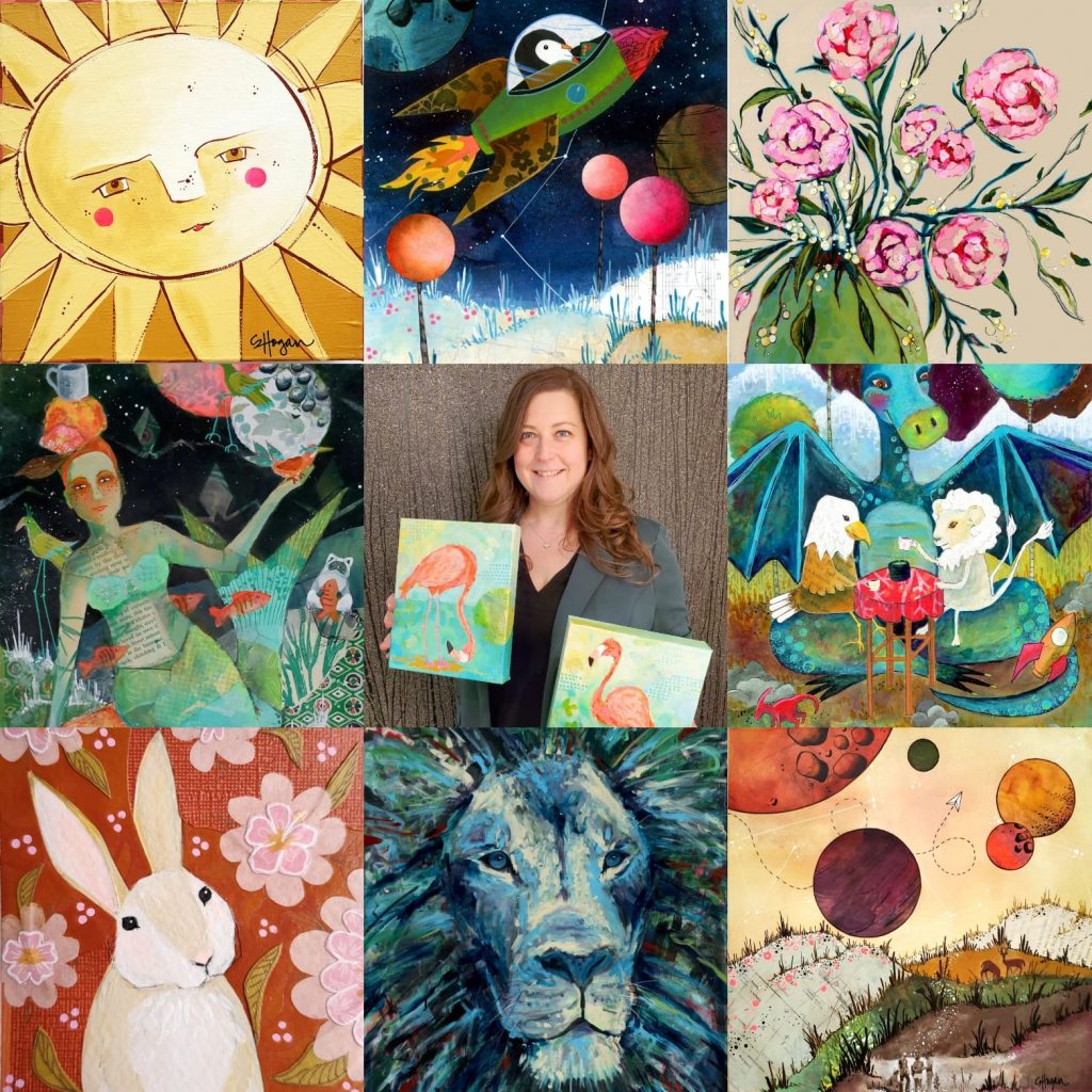 Steph Joy Hogan is an award-winning mixed-media painter from Lansing, Michigan. She was voted Top Artist in the 2021 Lansing City Pulse Top of the Town contest (Top 3 in 2018, 2019, 2020) and her recognizably vibrant and whimsical artwork has been featured in several Michigan galleries and many exhibitions with Mid-Michigan Art Guild and Working Women Artists, of which she recently served as President. Her artwork has been featured on a billboard and a bus stop, and her commissioned mixed-media paintings can be found permanently installed in Impression 5 Science Center, the Susan and Jack Davis Nature Pavilion and Gallery at Fenner Nature Center, and the beautiful new headquarters of The Davies Project.
