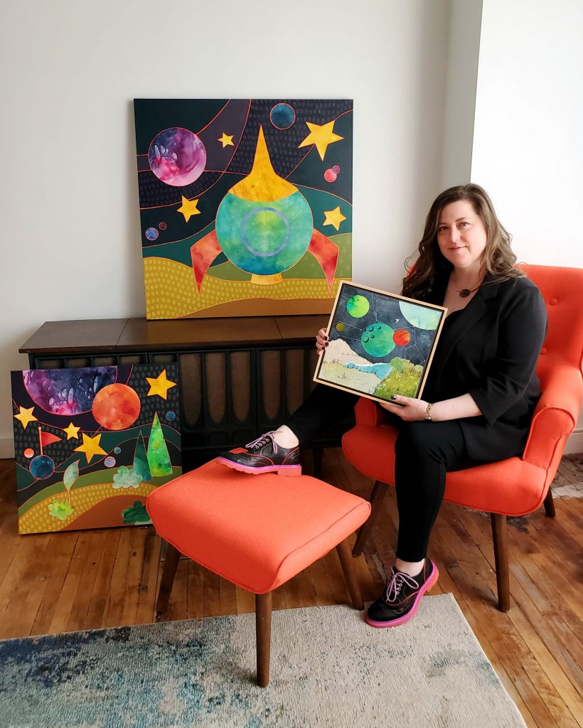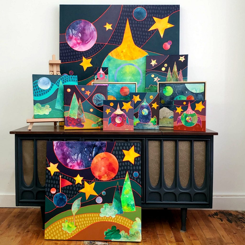 Original art and beautiful prints, joyfully created to energize your space and fuel your imagination. An explorer and storyteller at heart, I revel in bold color statements, unknown worlds and the absurd and delightful all around us. Inspired by the unbridled imaginations of children and working primarily with acrylic paint, ink and scraps of found paper ephemera (such as book pages, maps, sheet music, and brochures), I intuitively create layered skyscapes, imaginary universes and the whimsical creatures that inhabit them.